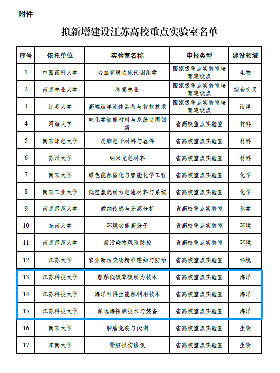 近日,江苏省教育厅公布《江苏高校重点实验室新增建设名单》(苏教科函〔2025〕21号)。全省共新增建设42个江苏高校重点实验室,我校获批立项建设“船舶低碳零碳动力技术实验室”“海洋可再生能源利用技术实验室”“深远海探测技术与装备实验室”等3个重点实验室,获批数量并列全省第一。